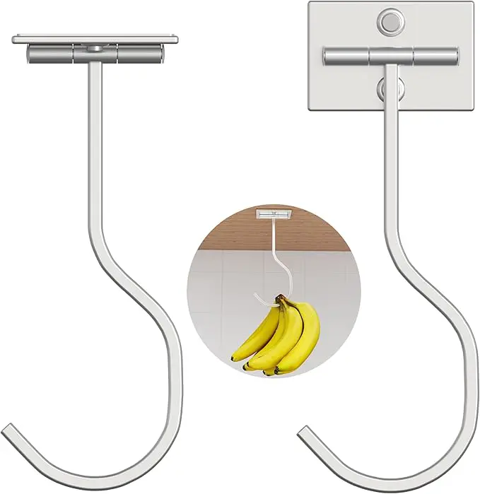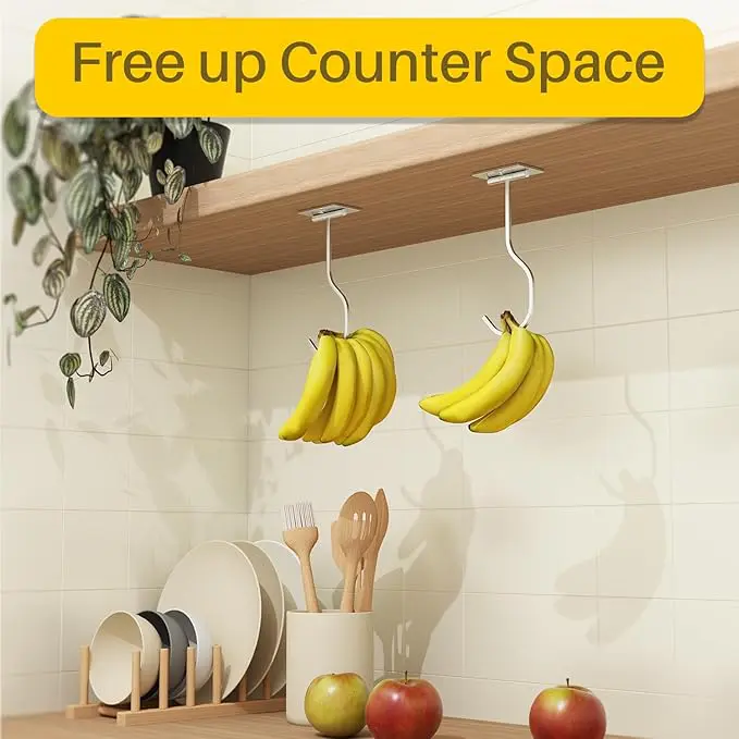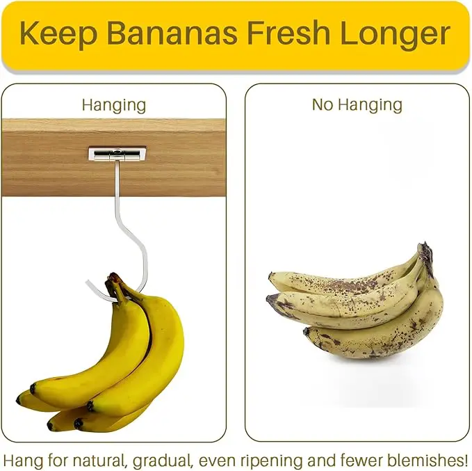 BananaLift™ Hook monteras diskret under köksskåpet och låter bananerna hänga luftigt – precis som de ska. Det ger jämn mognad, färre märken och bananer som håller sig fräscha längre. Samtidigt frigör du värdefull bänkyta och slipper frukt som ligger i vägen.