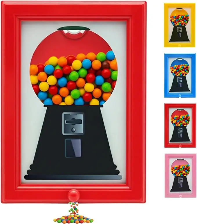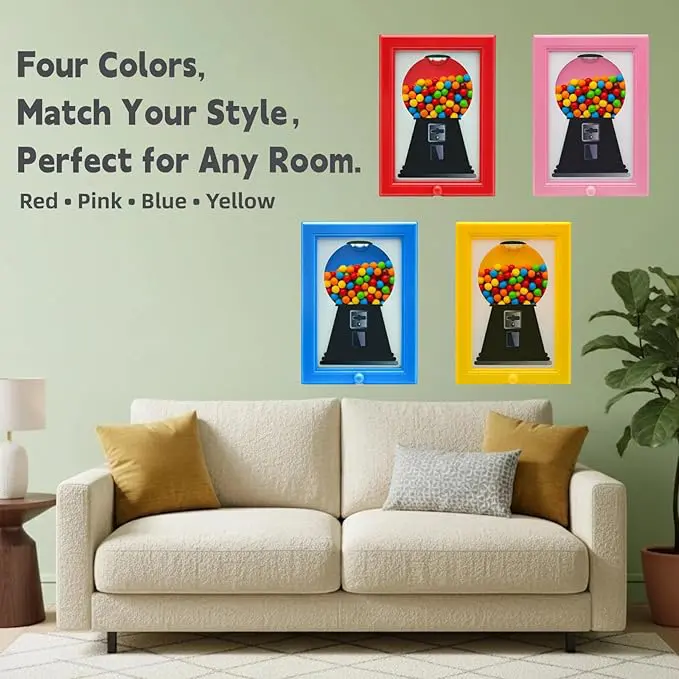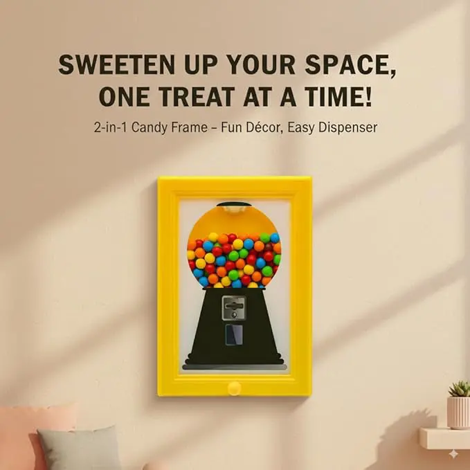 Candy Frame är en färgstark inredningsdetalj med lekfull retro-känsla. Den kombinerar klassisk gumball-design med modern inredning och gör godis till en självklar del av stilen. Häng den på väggen eller ställ den på en hylla – lika snygg i kök och vardagsrum som i spelrum eller barnrum.