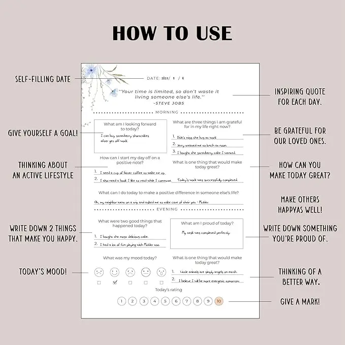 Använd den som tacksamhetsdagbok, affirmationsjournal, reflektionsbok eller kvällsrutin. Det odaterade formatet gör att du kan börja när som helst, pausa när livet kommer emellan och fortsätta utan stress eller pappersspill.