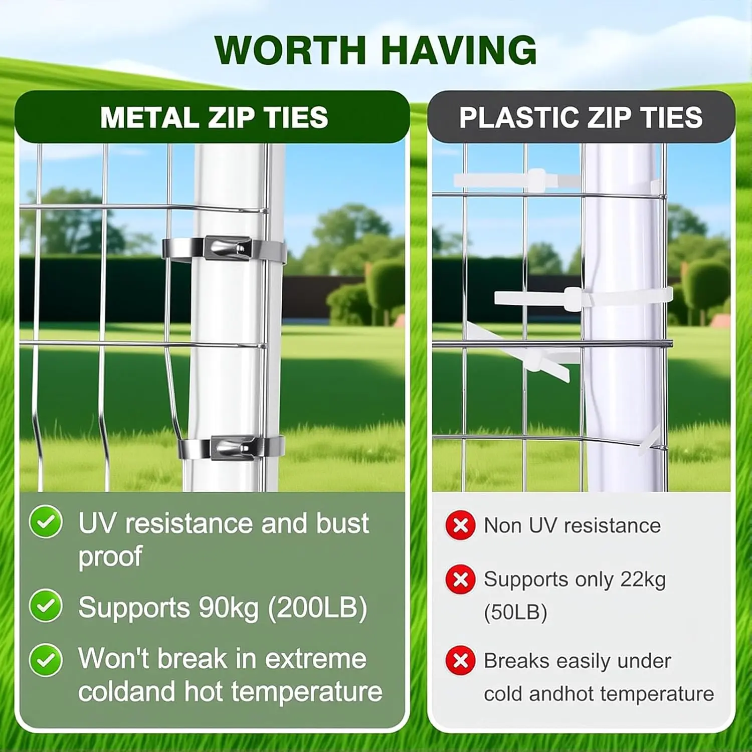 Tack vare det rostfria stålet klarar de både regn, kyla, värme och stark sol utan att försvagas på samma sätt som vanliga buntband i plast. Det gör dem till ett smart val för dig som vill göra jobbet en gång och känna att det verkligen håller.