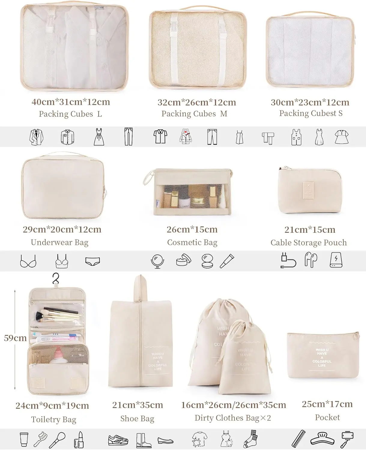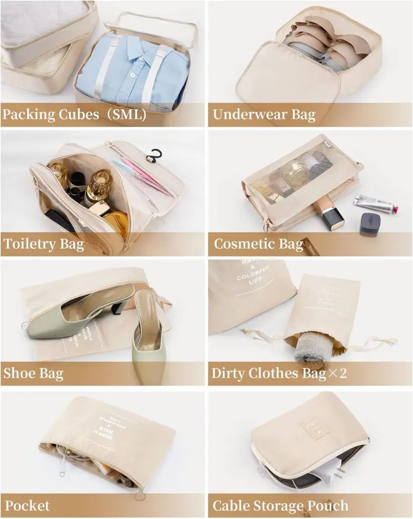 🧩 Komplett set – Innehåller flera delar, inklusive specialpåsar för skor, underkläder och accessoarer.